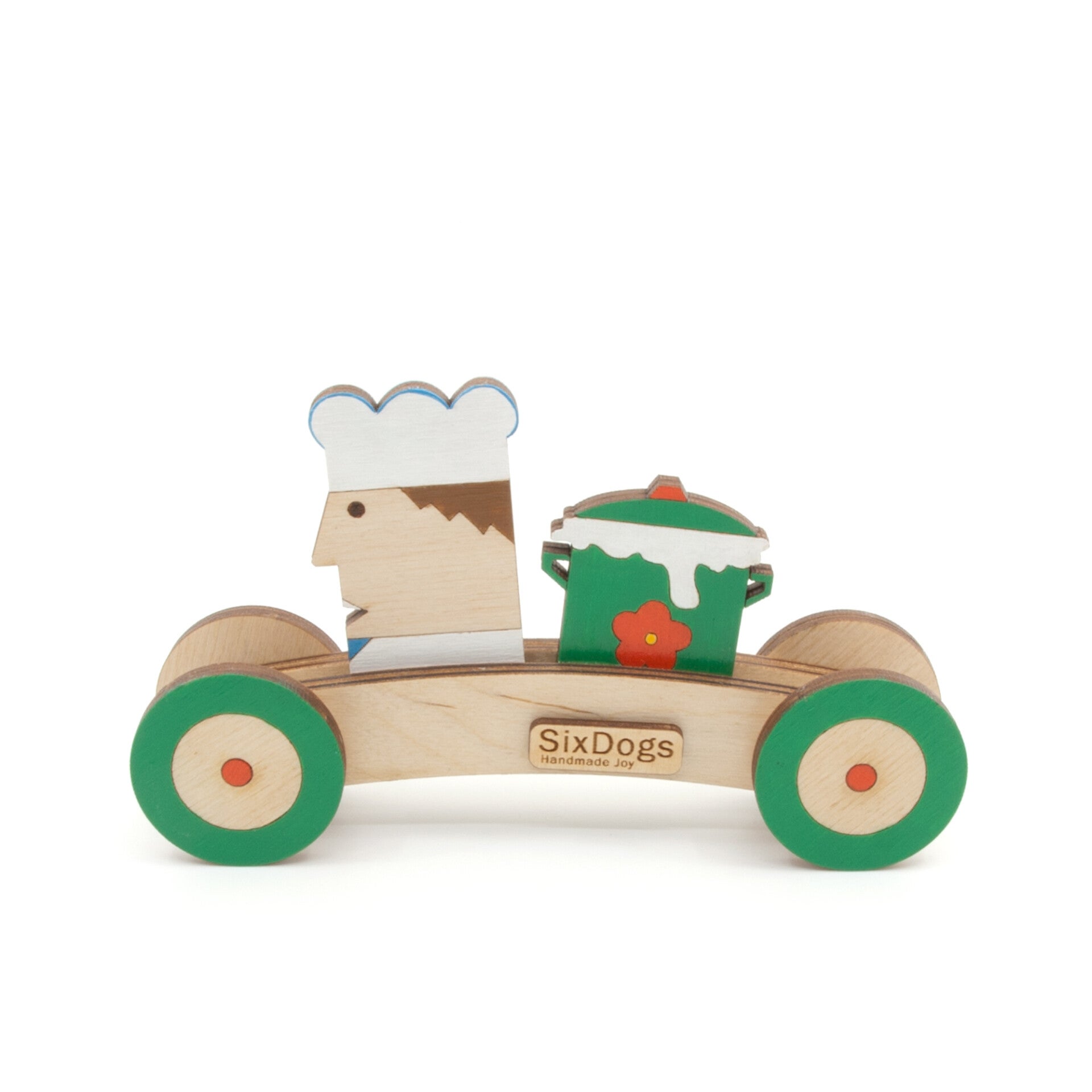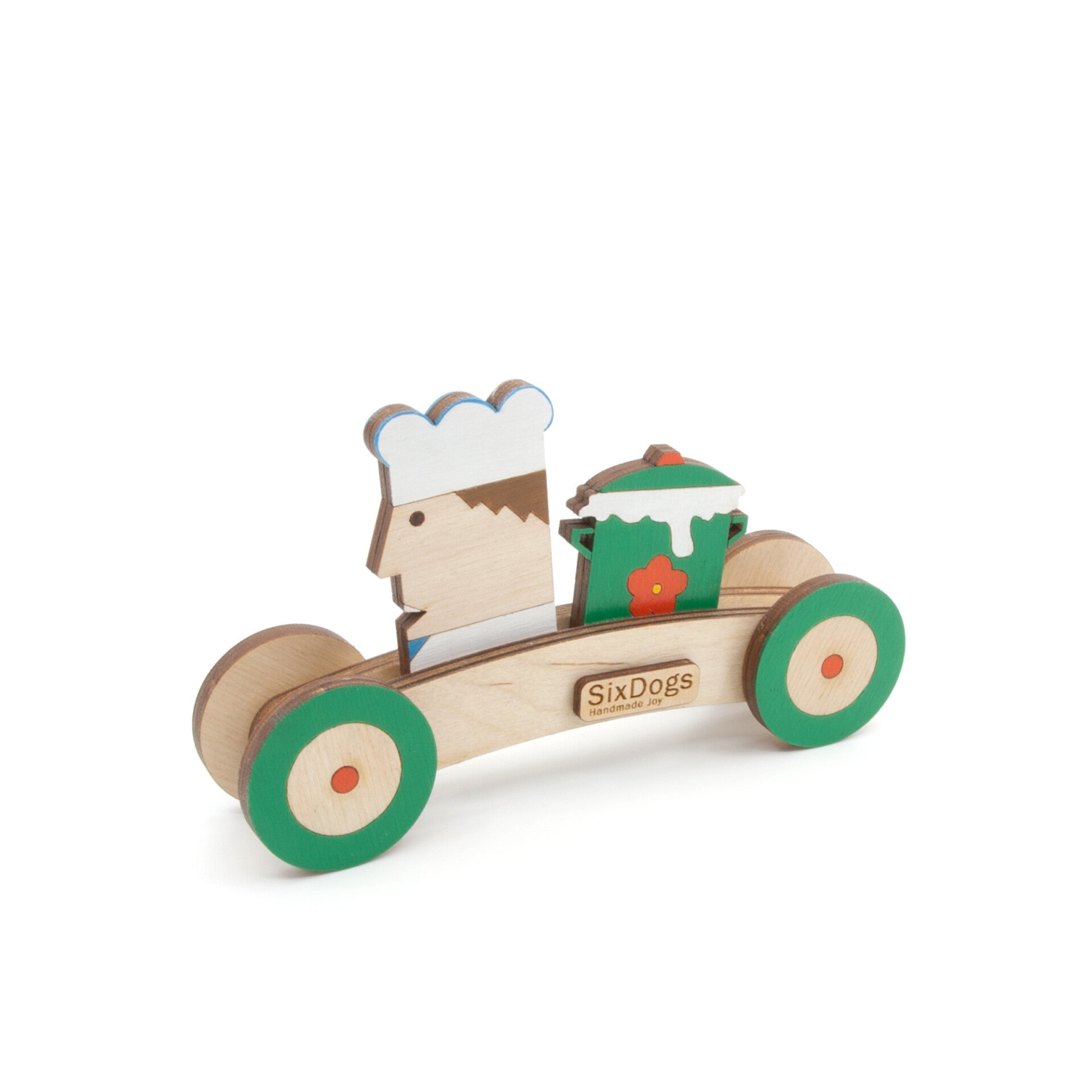 Het object is een uniek SixDogs-ontwerp en middels verfijnde technieken in eigen werkplaats duurzaam vervaardigd. De kleine series maken mogelijk dat ieder object individuele aandacht krijgt en persoonlijk wordt afgewerkt. De soepel rijdende car wordt gemaakt van duurzaam berken en in verschillende lagen opgebouwd. Ieder onderdeel wordt apart geschilderd en gelakt alvorens het geheel wordt gemonteerd.