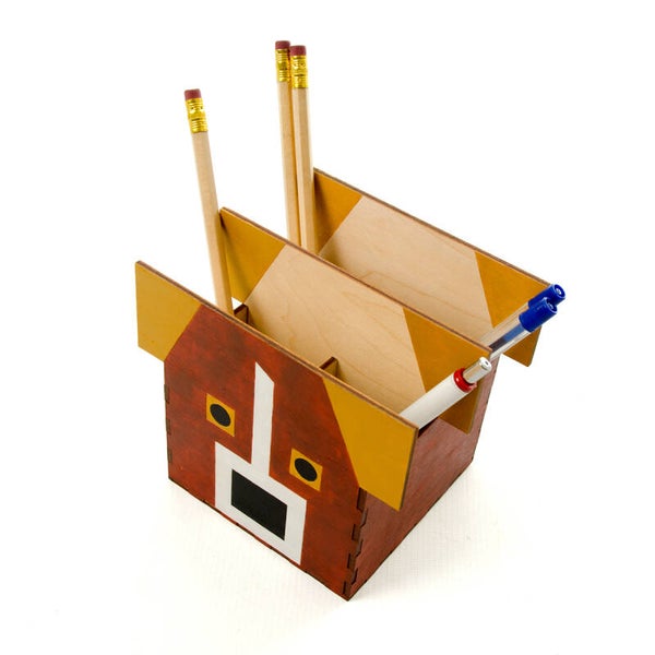 Materiaal: hout, verfijnde lasertechniek, acrylverf. De pennenbakjes worden in eigen atelier gemaakt.